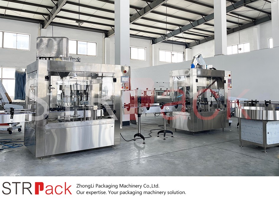 This STRPACK automatic powder filling line combines rotary powder filling and rotary capping for bottles. It ensures smooth container handling, accurate dosing, and reliable capping in a continuous workflow, all controlled via PLC and touchscreen for easy adjustments.